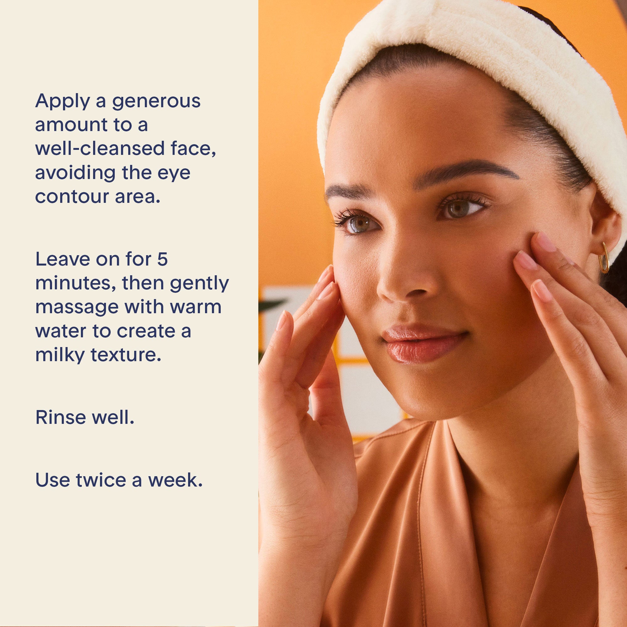 Apply a generous amount to a well-cleansed face, avoiding the eye contour area. Leave on for 5 minutes, then gently massage with warm water to create a milky texture. Rinse well. Use twice a week.